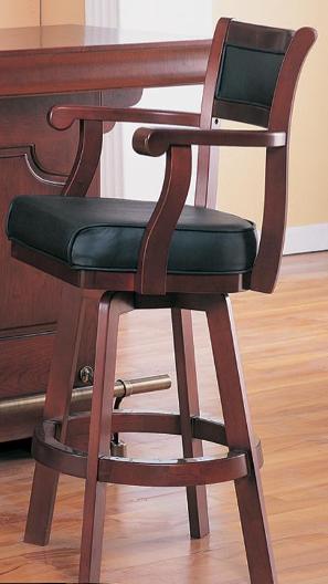 Bar StoolOffer the best to your guests with this beautiful swivel bar stool. The stylish black leather upholstery makes this stool comfortable, so you and your friends can enjoy time together in your home bar. The carved wood arms and straight legs are finished in a warm Cherry, for a traditional look you will love, making this stool ideal for enjoying company and sipping a pint or glass of wine.Dimensions: 22\”L x 23\”W x 45.50\”H*Item NOT Eligible for Return/Refund*