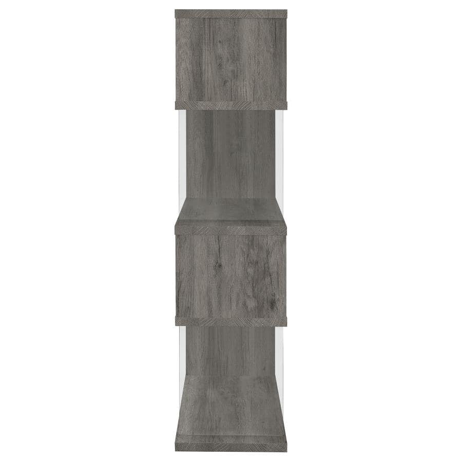 The asymmetrical zig-zag design of this contemporary bookcase creates a focal point in any room. Five open shelves in a light grey driftwood finish stack elegantly, supported by clear glass side panels that lend a modern flair to this furniture piece. Perfect for home offices, living rooms and much more, showcase anything from a book collection, decor, and other favorite items for all to see. With a flush base, this open bookcase unit rests sturdily and securely on the floor. Clean lines and a wonderful jagged design offer up style, functionality, and a stunning display.