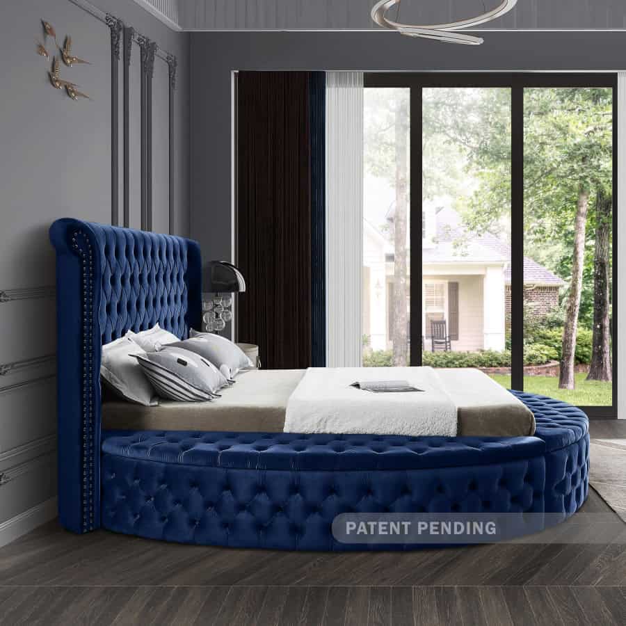 Marvel at the remarkable beauty and graceful lines of this round Luxus navy velvet queen size bed. The headboard, footboard and side rails are all adorned with deep button tufting, and there is nailhead trim on both sides of the tall headboard. The footboard and side rails all contain ample storage and seating, making it easy to sit down in comfort so you can put on your pants or shoes.