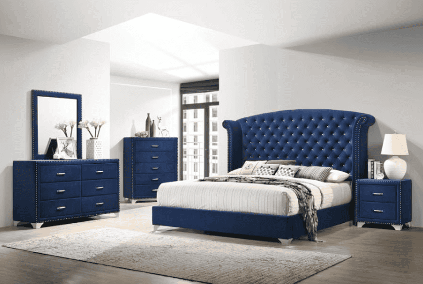 This gorgeous upholstered Melody Drawer Chest is upholstered in a Pacific blue velvet fabric. It features five storage drawers adorned with metal chrome finished bejeweled pull handles, nailhead trim, and stands on metal chrome finished feet.