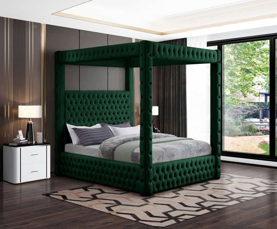 Create a bedroom sanctuary you never want to leave with this Royal velvet bed at its center. Justly named, this bed has a regal look that’s fit for a king (or queen). Stunningly crafted, the Royal bed features a canopy that towers over the top of the bed for a modish take on a timelessly affluent design. Deep tufting adds a textural look while the soft Green velvet upholstery shores up the bed’s sophisticated design.