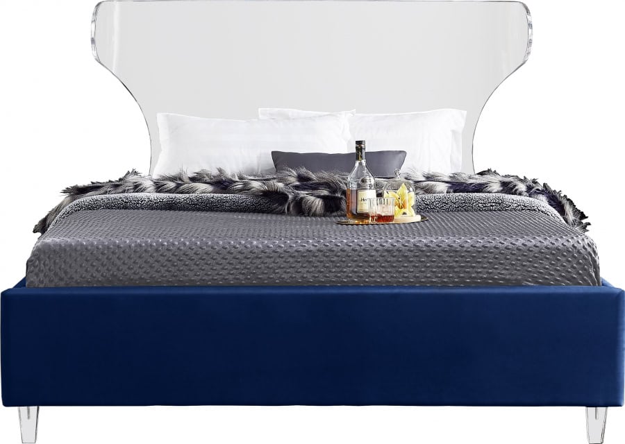 There’s nothing scary about the Ghost Navy velvet queen size bed, with its plush cushioned and upholstered side rails and footboard. A curved transparent acrylic headboard allows you to situate it in front of a window without blocking the view, and matching acrylic legs offer a beautiful contemporary appearance. This bed has a complete set of slats included for your convenience, so you won’t need to purchase a box spring.