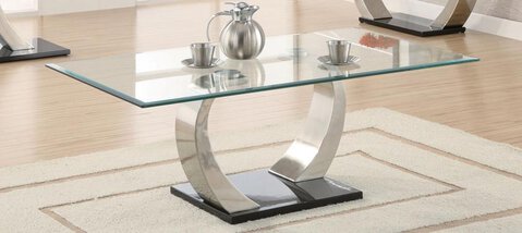 Coffee TableEnhance the flow of your contemporary style throughout your living room with this coffee table. It features striking curved metal legs with a high sheen black base. A floating glass top completes this sleek piece. Put this coffee table in the center of your living room and use it as a surface for your cocktails and appetizers. Complete this set with the end table and sofa table from this collection.Dimensions: 50\”L x 28\”W x 18.50\”H*Item NOT Eligible for Refund/Return*