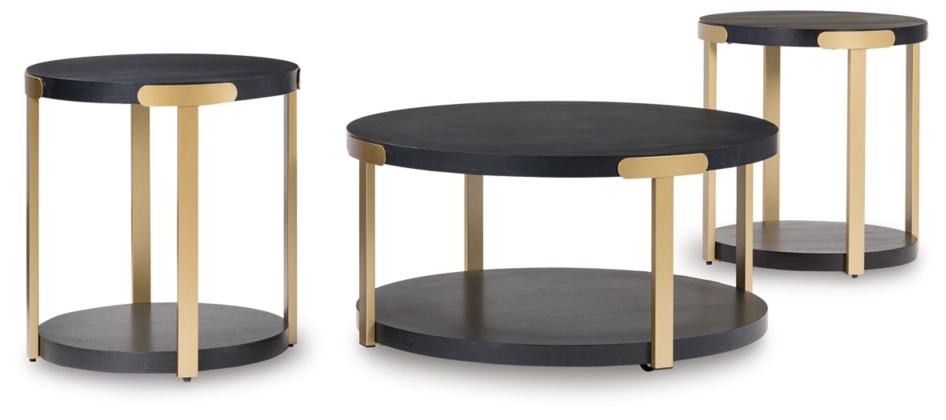Reflect your cool, contemporary eye for design with this table set. Pairing a gleaming goldtone finish and black wood grain pattern, it crafts a luxe look for your living room. The lower shelves are well-suited for displaying your favorite decor, while casters on the coffee table offer added flexibility.