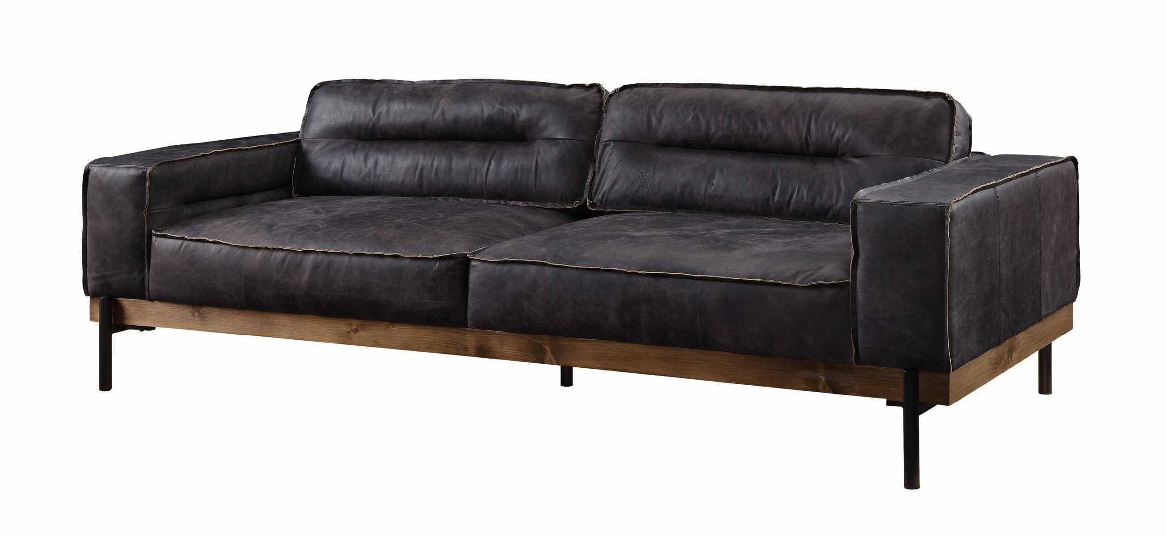 Part of the handsome Silchester Collection, this modern industrial sofa set will look great in any contemporary space. Contrast stitching makes the antique ebony top grain leather upholstery pop, and highlights the warm color of the wooden trim base. Metal spindle legs visually lighten the substantial proportions of this sofa set. Enjoy wide track arms and comfortable feather and foam seat construction, and relax in style.
