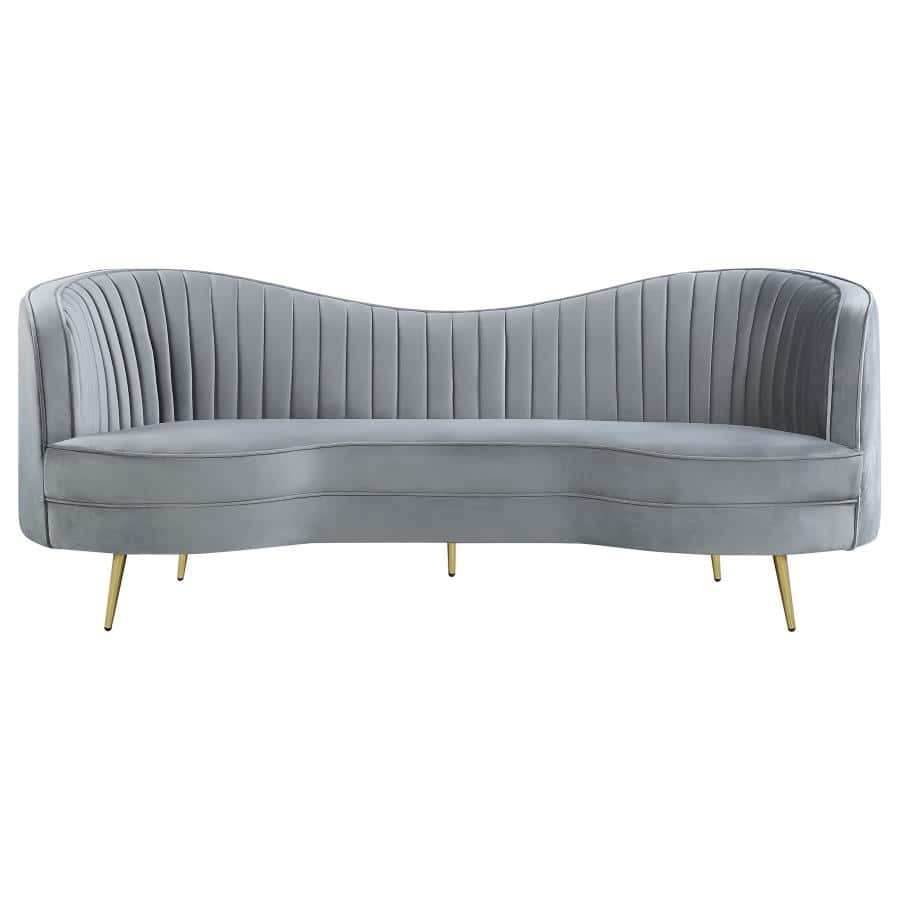 Adding a chic, mid-century inspired vibe, this elegant sofa delivers the magic of a fashionable interior design period while lending a sophisticated anchor piece to an upscale living space. Embrace the iconic kidney silhouette known for its era, making the most of alluring curves. This sofa is fully encased in solid wood and covered in soft, supple gray velvet. Dressed up with tailored, vertical channels on its interior back, dimensionality becomes a key feature. Gold finish stainless steel tapered legs round out the list of charming attributes, making this a go-to piece for a stylish modern or transitional space.
