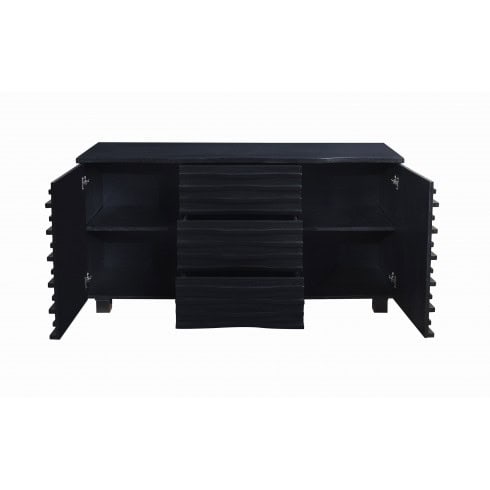 The Stanton Server by Coaster Furniture will give your contemporary casual dining and entertainment room a bold update. With this unique wave design and different chair options you can mix and match to create the perfect look for your home. Made from Ash veneers and finished in a rich black. Matching server features ample storage with cabinets and shelving.