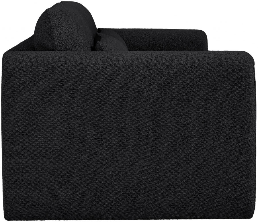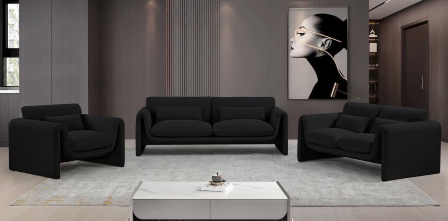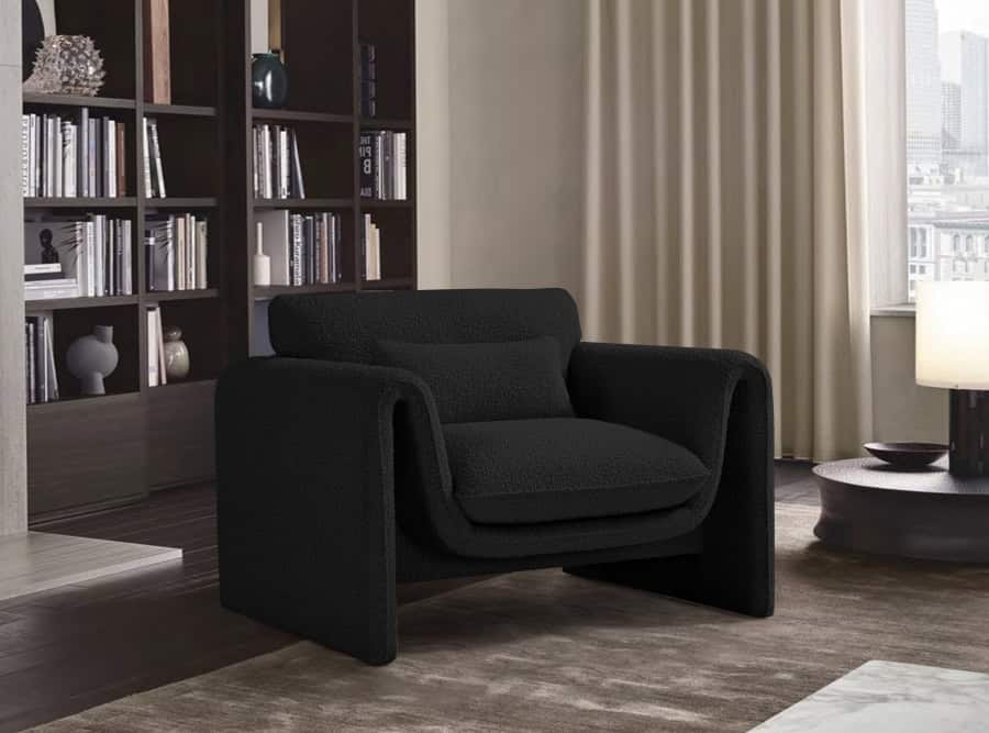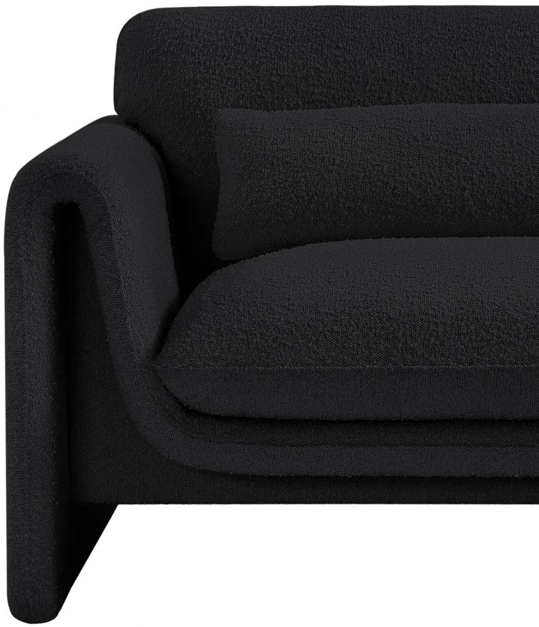Impress family and guests alike with this Stylus boucle fabric sofa. This modish chair oozes contemporary panache with its curved arms and unexpected design elements. Thickly padded seat and back cushions cradle your body in supportive comfort while the rich black boucle fabric caresses the skin and leaves you feeling relax and recharged. A wood frame ensures that the chair withstands the rigors of daily use without losing its lovely yet contemporary look.