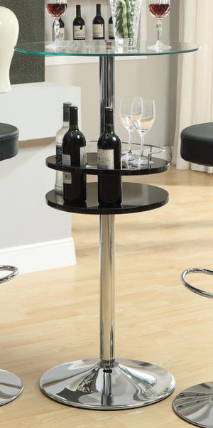 Function meets style with this bar height table. It offers a 23.5 diameter round 5x stronger tempered glass top and chrome finish pedestal base. The black finish storage at the center includes three openings for wine bottles and half-shelf with rail where you can keep a couple of wine glasses. This stylish bar table is a cool addition for your dining and entertaining area.