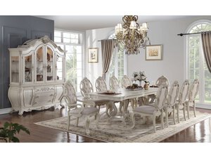 Table, (8) Side Chairs, and (2) Arm ChairsThe Ragenardus formal dining collection shows traditional style that is designed to impress. Each piece of this collection demonstrates delicate craftsmanship and intricate carved detail. Matching hutch and buffet reflect all carefully selected design that will be the showpiece of your formal dining room. Table Dimensions: 44\”W x 90\”~114\”L *Includes 1 x 24\”Leaf*Side Chair Dimensions: 43\”HArm Chair Dimensions: 43\”HSeat Depth: 19\”Seat Height: 19\”*Item NOT Eligible for Refund/Return*